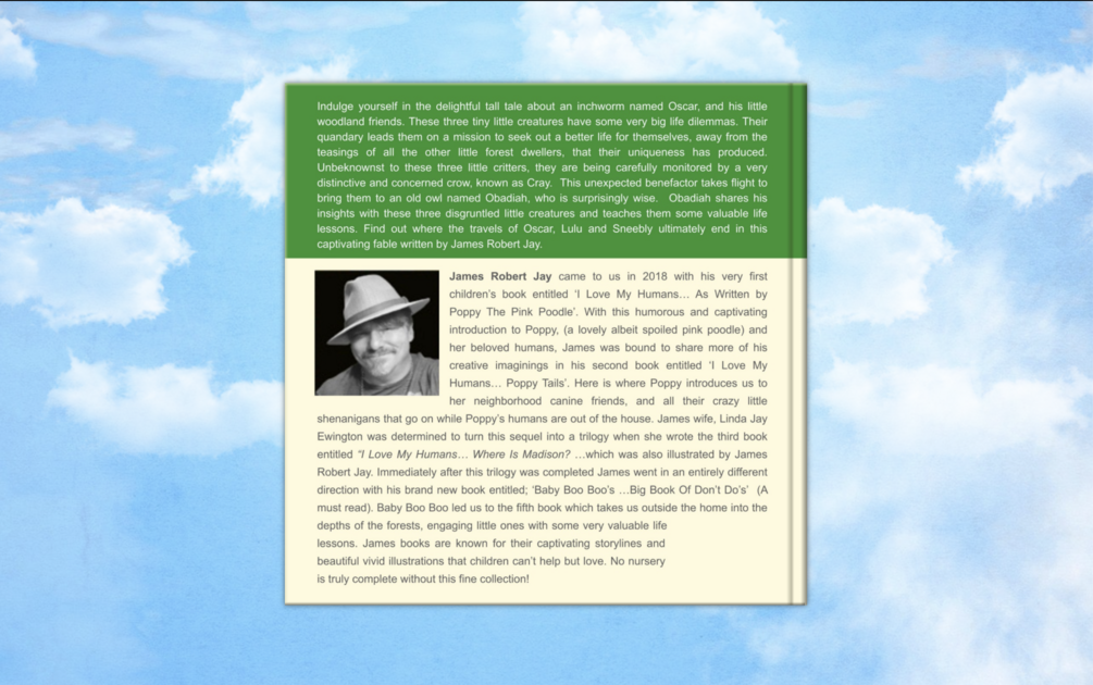 Indulge your children in this delightful tall tale about an inchworm named Oscar, and his little woodland friends. These three tiny little creatures have some very big life dilemmas. Their quandary leads them on a mission to seek out a better life for themselves, away from the teasings of all the other little forest dwellers, that their uniqueness has produced. Unbeknownst to these three little critters, they are being carefully monitored by a very distinctive and concerned crow, known as Cray. This unexpected benefactor takes flight to bring them to an old owl named Obadiah, who is surprisingly wise. Obadiah shares his insights with these three disgruntled little creatures and teaches them some valuable life lessons. Find out where the travels of Oscar, Lulu and Sneebly ultimately end in this captivating fable written by James Robert Jay.